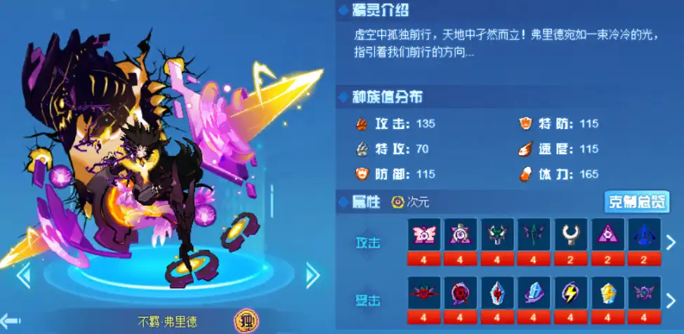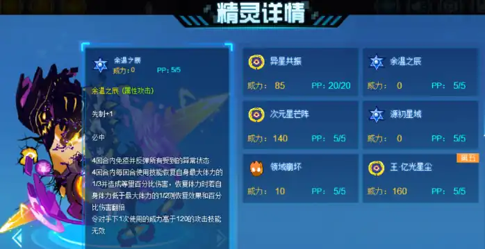 它拥有强大的控场输出能力十分适合pvp,它的专属特性能在当回合未击败对手的情况下,让自己的随机三项属性+1,且50%概率让对手害怕,为成功触发害怕时则50%概率触发瘫痪,当该回合成功击败对手还会吸取下一个出场对手的最大体力并且全属性+1,它的第五技会消除掉对手回合类效果,成功后在接下来两回合内敌人无法通过技能来回复体力,并附加对手自己最大体力20%固定伤害,每次使用增加10%最高能加到40%;