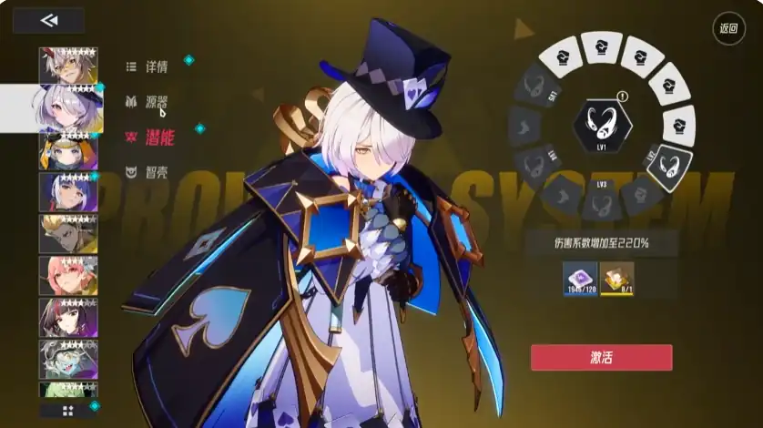 破序原质属性角色,作为魔术师,她的招式就和魔术一般令人捉摸不透。普攻”帽子戏法”,让单体敌人受到200%伤害,有40%概率提高自己和行动进度最低的队友10%的行动进度,而且拥有“双生戏法”的队友会追击敌人;双生戏法每次在梨梨行动后提高自己30%行动进度,并且她只能对出自己之外的一个目标附加该效果,她死亡时该效果失效。