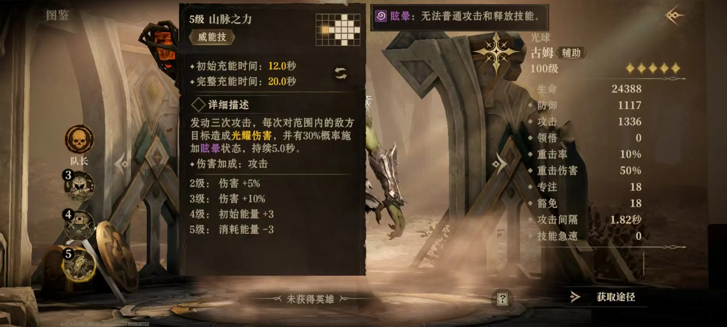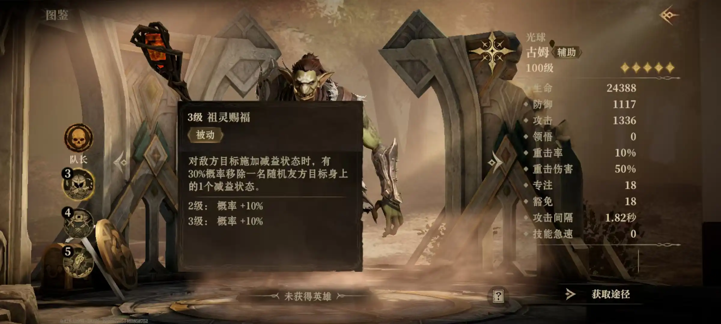 古姆的队长技能是一级豁免光环,在所有战斗中都可以额外提升己方目标40点豁免。这里肯定有很多玩家对于豁免了解的不多,豁免指的是能降低敌方对英雄释放减益控制效果,或者是移除增益状态的成功几率。当英雄豁免高出对方专注80点的时候,抵抗效果几率较高,这就意味着如果面对敌人拥有较多的减益状态,就可以利用古姆的队长技能提高豁免来进行抵挡。