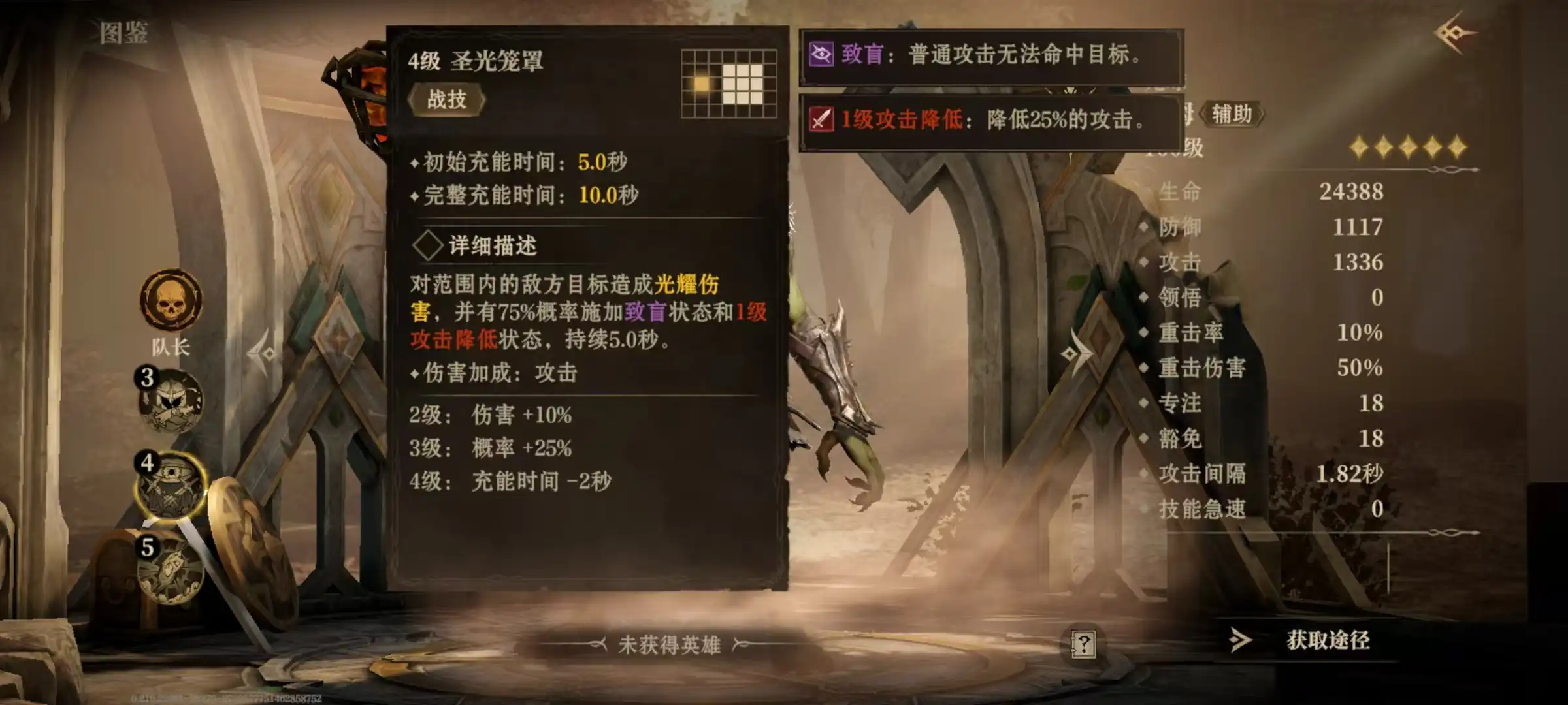 被动技能祖灵赐福对题方目标施加减益状态时有百分之三十几率移除一名随机友方目标身上的一个减益状态。该被动是需要配合自身的战技和威能技来使用,具有一定的净化能力。战技是圣光笼罩,对范围内的敌方目标造成光耀伤害,并有75%概率施加致盲状态和一级攻击降低状态,持续5秒钟。对方被致盲之后,普通攻击就无法命中目标,一级攻击降低效果可以降低对方25%的攻击力。威能技山脉之力,发动三次攻击,每次都能对范围内的敌方目标造成光耀伤害,有30%概率施加眩晕状态持续5秒钟。对方被眩晕之后就无法进行普通攻击和释放技能。