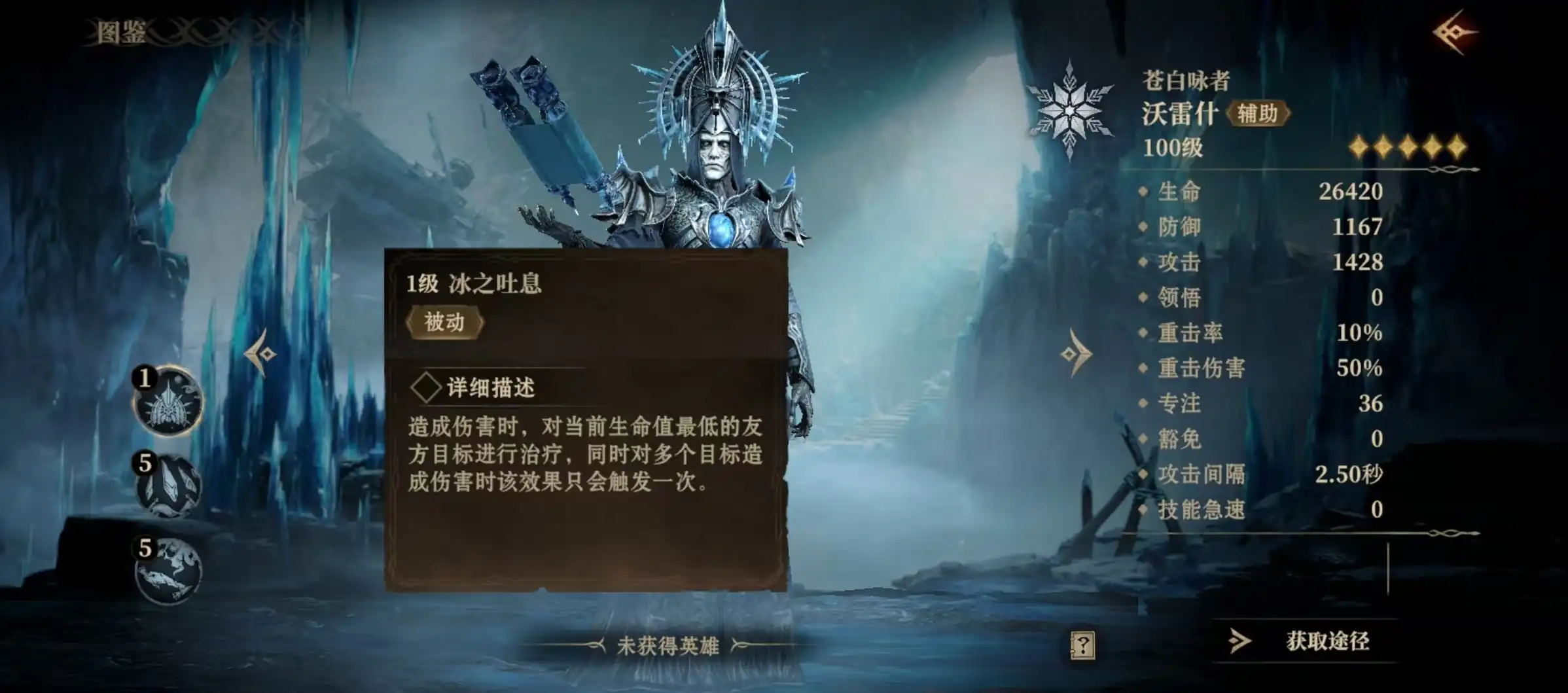 沃雷是作为一名辅助英雄,他擅长将敌人身上的增益状态移除,还具备一定的治疗能力,可以说是比较全能的一个。被动系冰之吐息,当造成伤害时,会选择生命值最低的有方目标进行治疗,同时对多个目标造成伤害时,该效果只会触发一次。也就是每回合只要打出伤害都能进行一次治疗,数值不高,但也相当于有了续航。