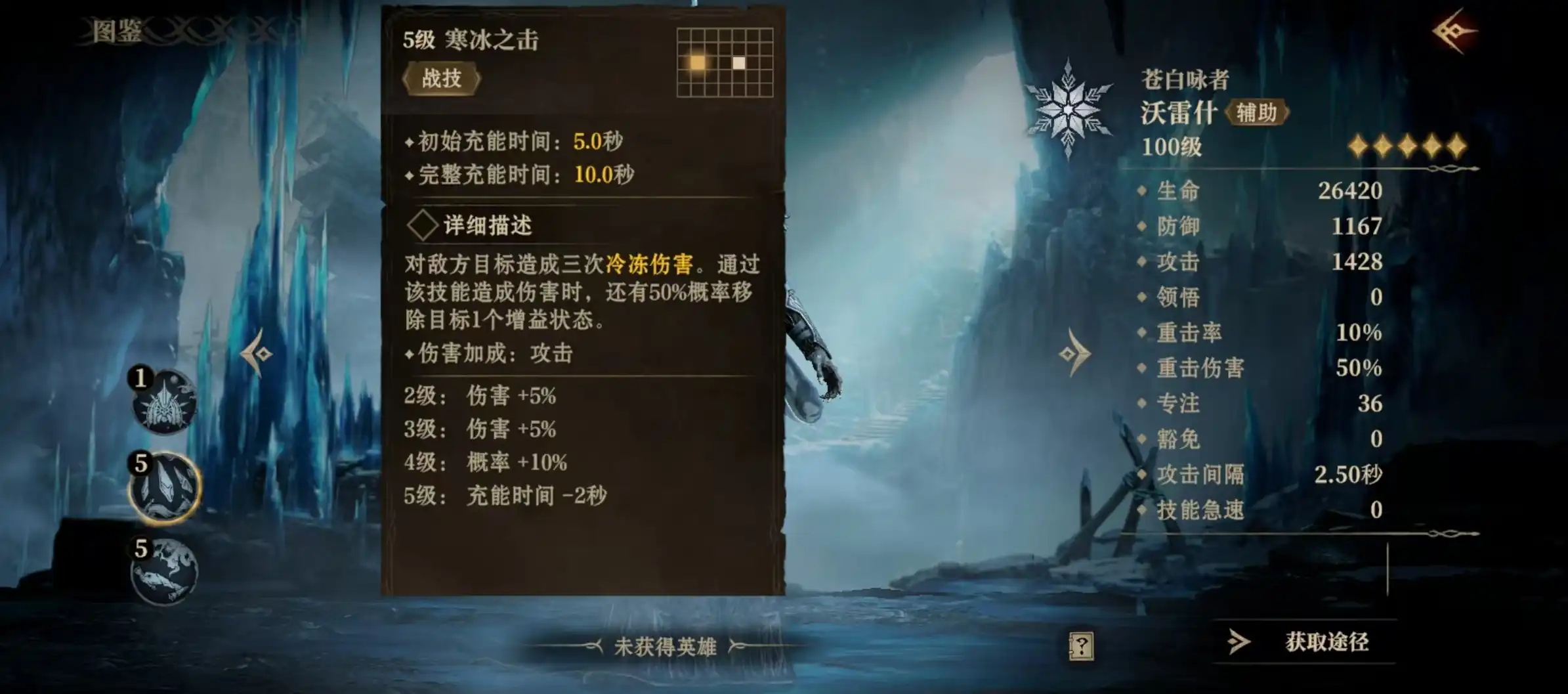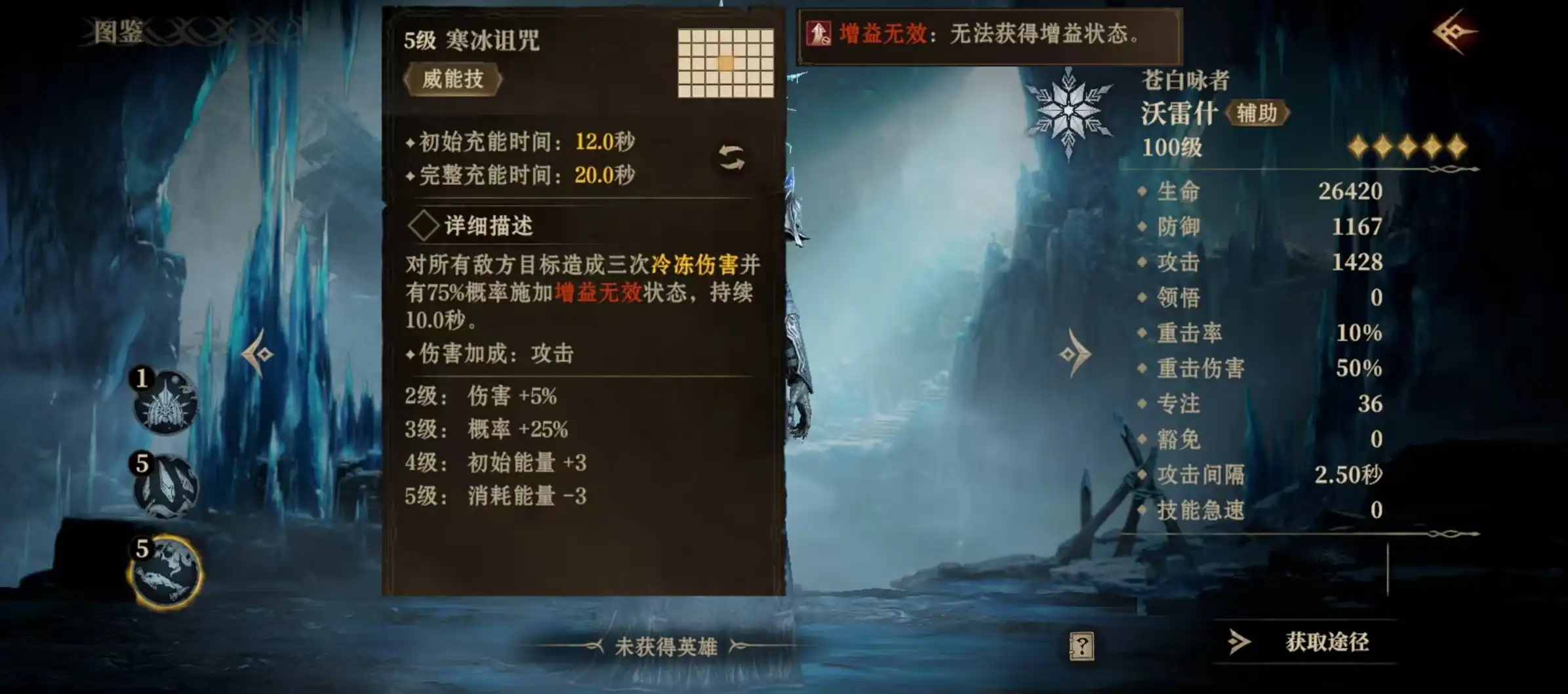 战技寒冰之击,对敌方目标造成连续三次冰冻伤害,通过该技能造成伤害时,还有5%概率将目标身上的一个增益状态移除,这三次伤害基本上可以保证100%移除一个增益,能大大削弱对方,至于消除的是哪一个增益状态则无法判定。威能技寒冰诅咒,对所有的敌方目标造成三次冷冻伤害,并有75%几率施加增益无效状态,持续10秒钟,对方被增益无效状态影响之后,就无法获得增益状态,这对于一些依靠增益来起决定性作用的流派来说,是很重要的削弱,大大延缓了对方的整体强度和节奏。