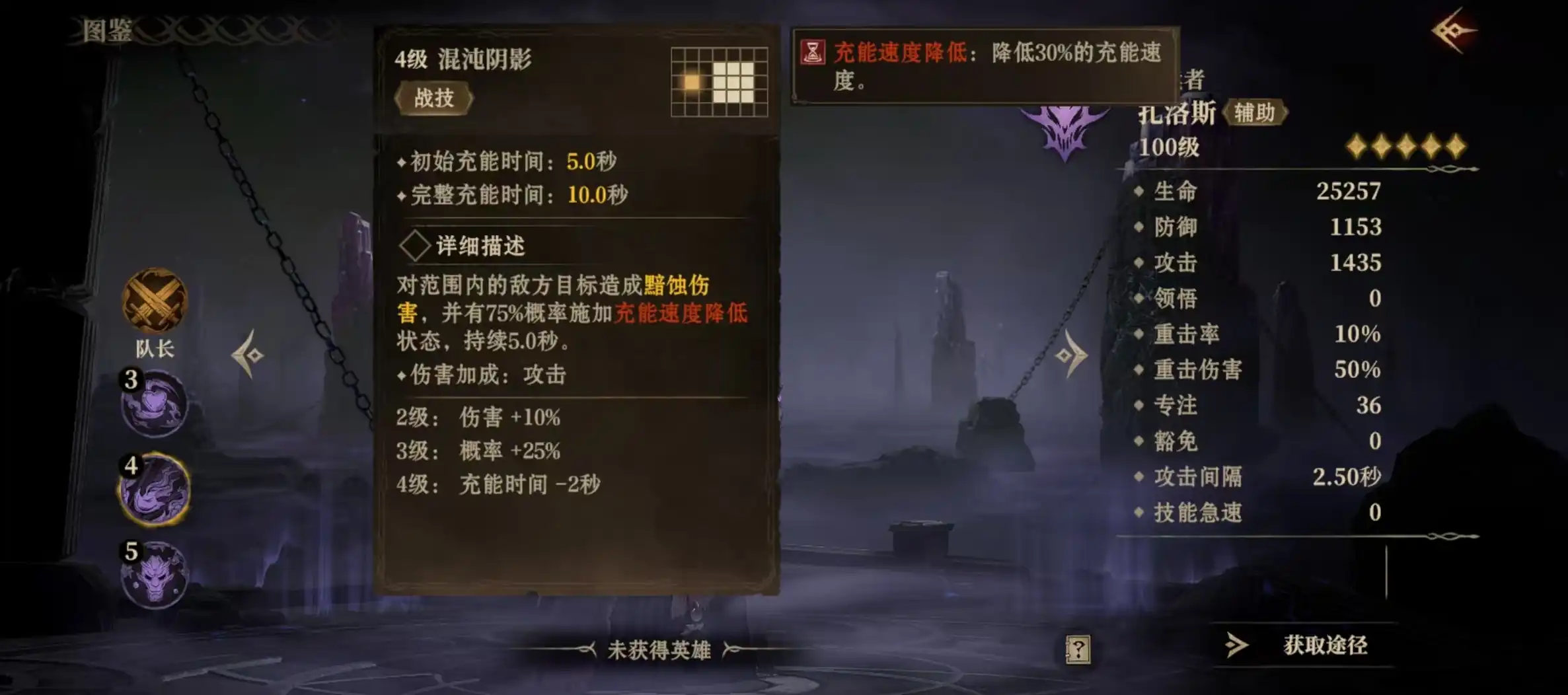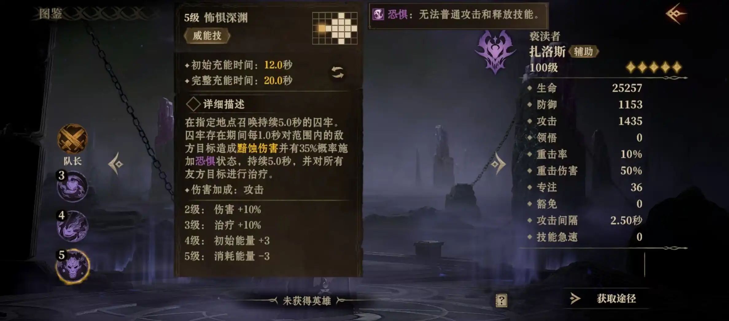 战技混沌阴影,伤害范围达到九格,对范围内的敌方目标造成黯蚀伤害,并有75%概率施加充能速度降低状态,有效降低对方充能速度,也就能延缓对方的输出节奏,降低数值为30%,该技能施法范围大影响广泛。威能技怖惧深渊,在指定的地点召唤持续5秒的囚牢,囚牢存在期间,每一秒钟都能对范围内敌方目标造成黯蚀伤害,并有35%几率施加恐惧状态,持续5秒钟,对所有己方目标进行一次治疗,该技能的影响范围更为广泛,几乎覆盖了对方全域。