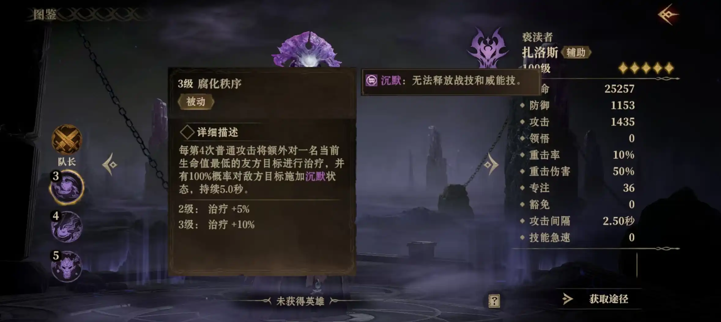 扎洛斯具有队长技能,带来的是一级攻击光环,所有战斗中都能提升己方目标24%攻击,如果没有更合适的队长技能,扎洛斯也是可以成为队长。被动技能腐化秩序,在第4次普通攻击时,将额外对一名当前生命值最低的己方目标进行治疗,并有100%几率对敌方目标施加沉默状态。对方被沉默之后,无论是战技还是威能技都无法释放,所以是现在非常有效的控制手段,长达5秒的沉默有可能扭转场上的局势。