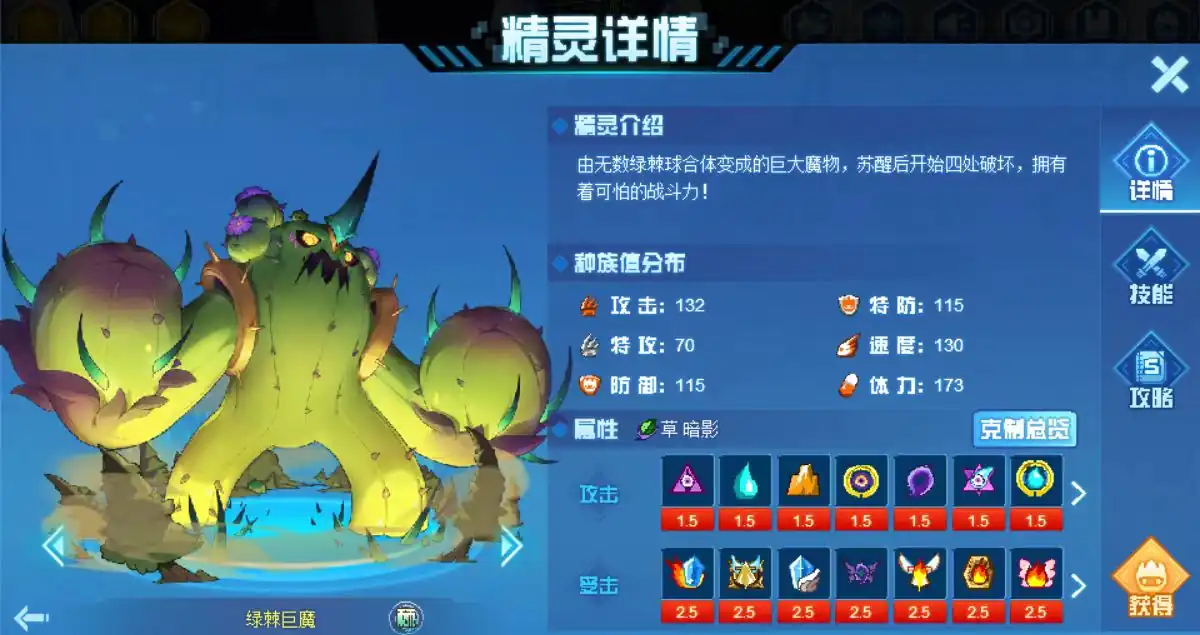 绿棘巨魔是属于草暗影系的精灵,他会在每回合附加固定伤害,每回合我方使用技能全属性减一,具有的技能包括大地汲取、荒漠生长、狂怒奋战等。大地汲取可以随加附加200~300点固定伤害,属于特殊攻击类型。荒漠生长是属性攻击,具有必中,全属性加1的特点,体力低于对手时,提升效果翻倍,自身能获得一个吸收500点伤害的护盾,护盾消失时造成300点固定伤害,还有50%的几率使对手感染,下两回合每回合都使得对手的先制减2。