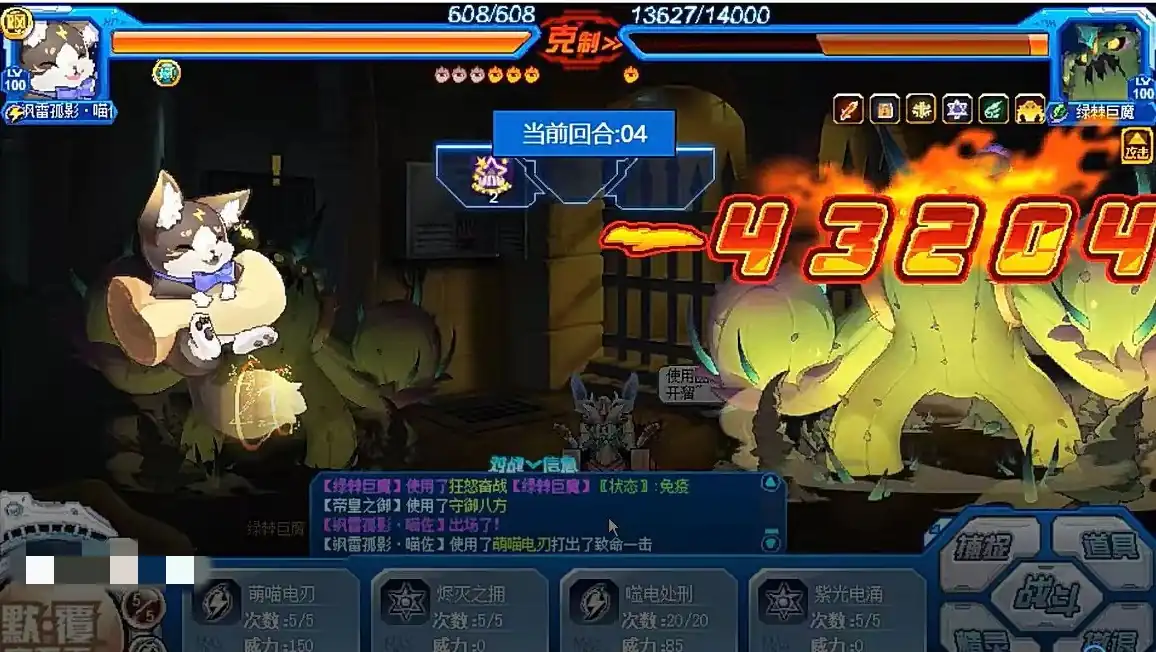 然后蒂朵下来上场送死,触发星璨舞台效果,同样有130%绑定场地增伤。接下来直接将帝皇之御守御八方拿出来自暴,附加必先必报效果。飒雷孤影喵佐变威力技能,萌喵电刃,这样能将boos的第一条生命值秒掉。塞娅最后登场。使用变威力技能鬼魅惊雷剑。秒杀第二条命,变威力技能在暴击时可无视对方的防御提升效果。