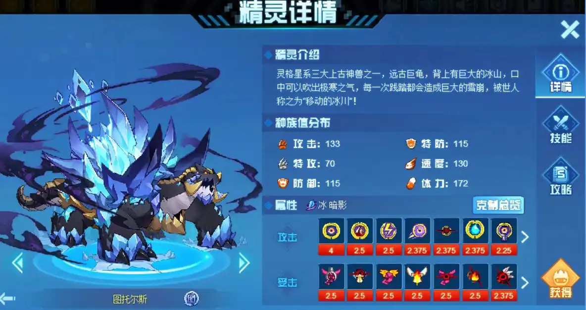 图托尔斯是属于冰暗影系的精灵,所具有的技能包括属性攻击万棱腹甲和巨峰冰山,特殊攻击薄雪雾隐,以及物理攻击骤寒急冻掌。万棱腹甲作用是4回合内免疫并反弹所有受到的异常状态,命中之后50%几率令对手冰封,如果没有触发,恢复自身最大体力的1/3,且三回合内自身受到的伤害不会超过300,3回合内受到攻击则100%令对手随机两个技能pp值归零。