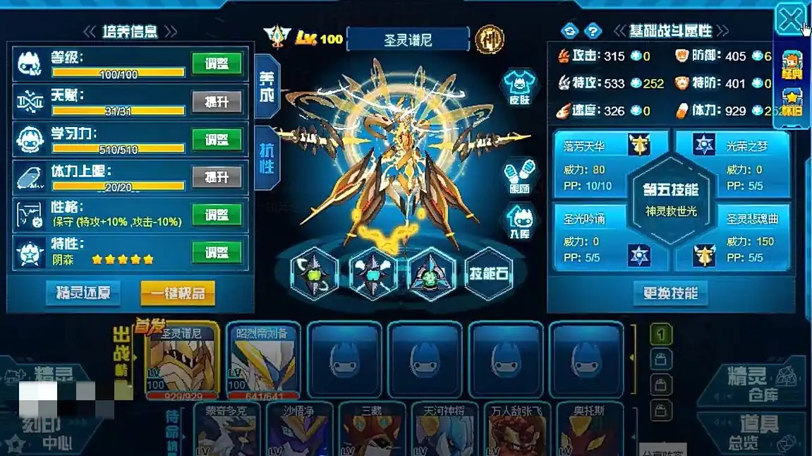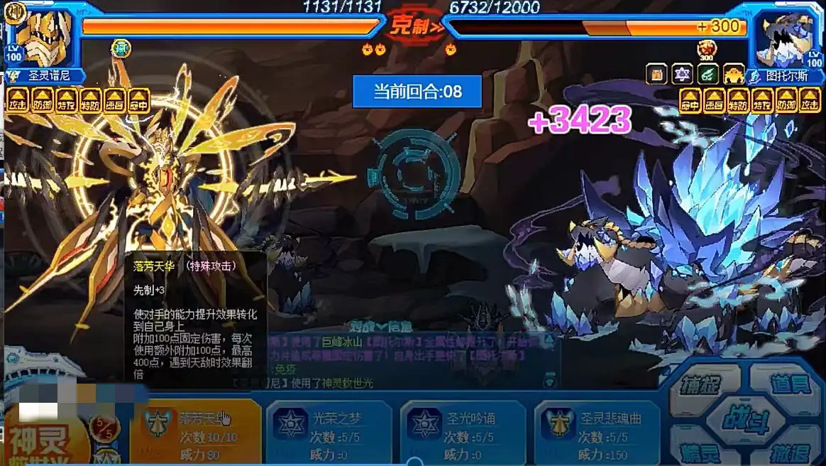 搞清楚了这些技能效果后,接下来选择哪些精灵出战,以及搭配的顺序就非常明了了。小编非常推荐使用圣灵谱尼来作为主力。战斗过程就是用圣灵普尼直接刚到底,首发先三落芳天华吸取强化,然后一直使用第五技能神灵救世光来输出。中间穿插进150大招圣灵悲魂曲,概率封住属性,因为该boss的两个属性技能都是可以回血的,所以不封住,战斗节奏将会拉长太多。