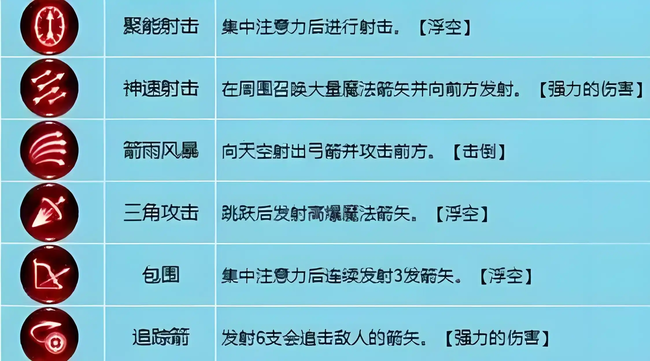 弓箭手手中的弓箭有着非常远的射程,尤其是他的三角攻击和神速攻击这两个技能更是将射程的优势给全部发挥了出来,神速射击就是将周边的魔法元素吸引到自身然后发出高速一箭,这也是攻击力比较强的一招,三角攻击更是一种可以向敌人发射高爆魔法箭矢的技能。