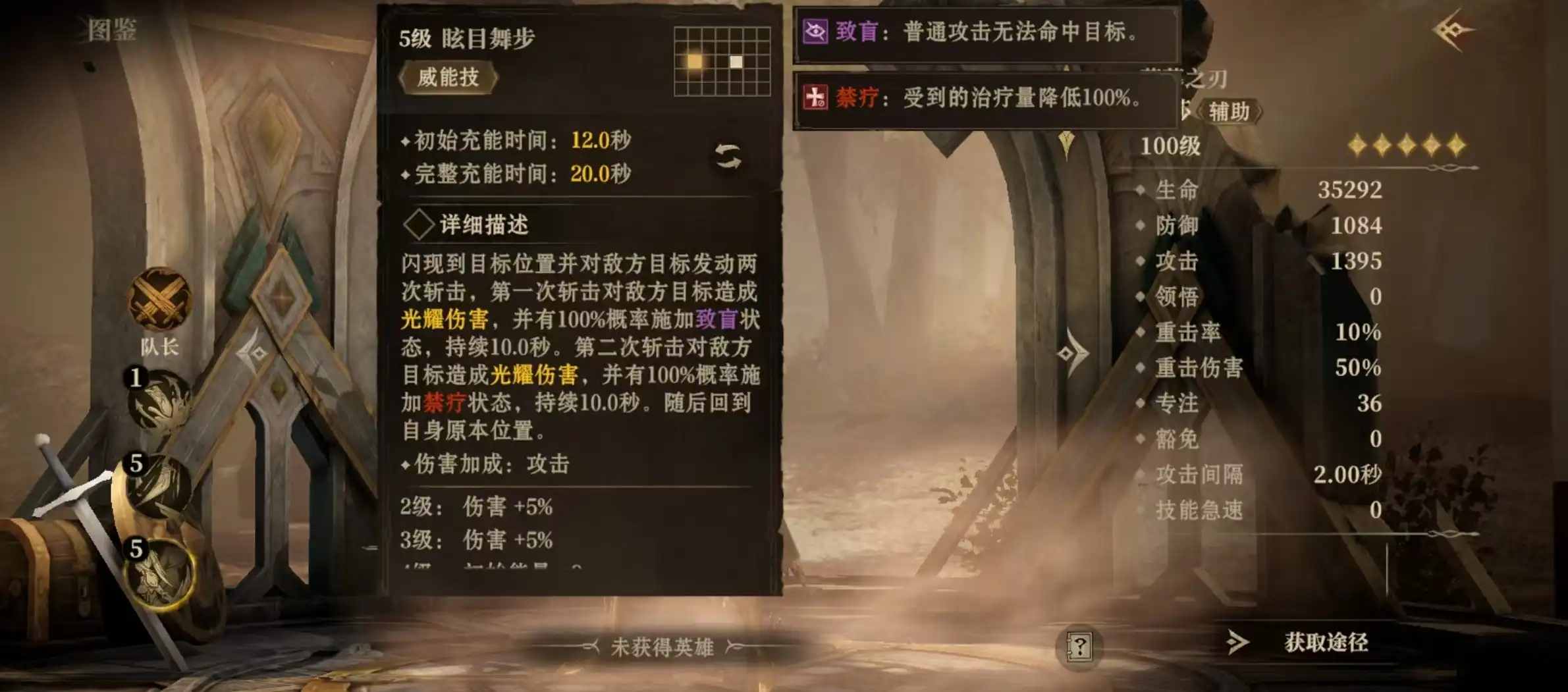 战技暮色斩击,投掷出一把匕首,对敌方目标施加二级攻击降低状态,持续5秒钟。随后直接冲到目标身边,发动一次斩击,造成光耀伤害。二级攻击降低能够降低目标50%攻击力,这一效果的影响还是非常大的,直接废掉了对方的一个输出目标,而且是属于点对点释放的技能,有一定针对性。威能技能炫目舞步,闪现到目标位置,对敌方目标发动两次斩击,第1次造成光耀伤害,100%几率施加致盲,持续10秒钟。第2次造成光耀伤害,100%几率施加禁疗状态,持续10秒钟,攻击完两次之后回到自身位置。