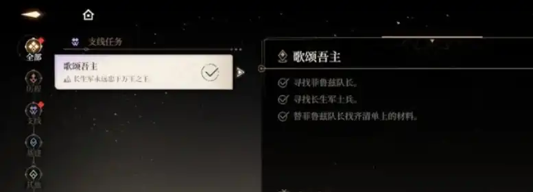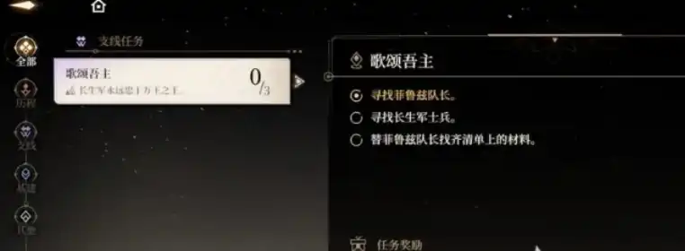 这个任务有三个要求,第一个要求就是寻找传说中的菲鲁兹队长,第二个任务就是一位长生军士兵中的首领,第三个任务便是协助长生军寻找一系列稀有材料,从而满足清单上的所有需求便可以完成任务。