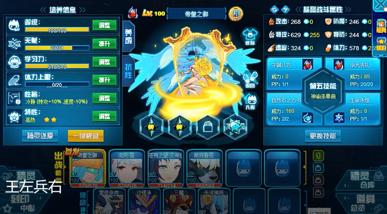 圣灵光系,10000血,必先,封属,天生攻击+2。己方技能使用后自强化被清除,3命,仅受暴击伤害。150大招超界审判10%概率三倍伤害,能力提升状态下概率翻倍,EVP有效。属性技能禁灵领域全属性+1,强化翻倍,4回合回血1/3;升临恩泽每回合200固伤,体力低于对手时固伤翻倍并免疫1次攻击,EVP有效。