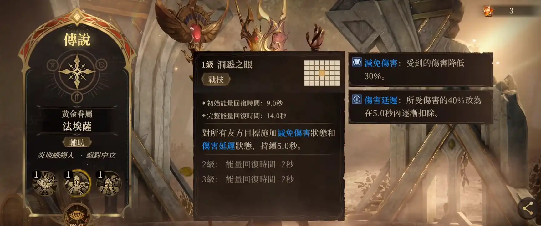 洞悉之眼可以为全队提供短暂的伤害缓冲效果,在面对强敌或者高爆发技能时尤为重要。同时,对于新手来说,法埃萨的战技可以部分替代专属护盾角色,是一个性价比很高的选择。