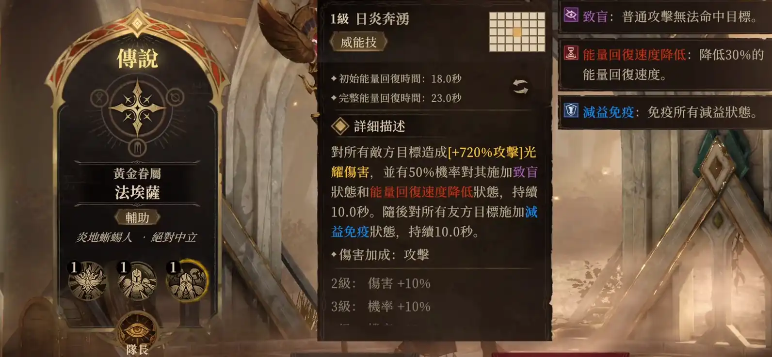 效果:对所有敌方目标造成+720%攻击光耀伤害,并有50%几率施加致盲状态和能量恢复速度降低状态,持续10秒。技能释放后,还会对所有友方目标施加减益免疫状态,持续10秒。日炎奔涌兼具范围输出和控制,是团队应对敌方减益技能的强力反制手段,同时提升了友方的生存能力。