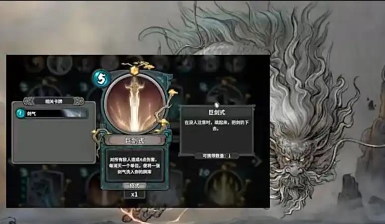 巨剑式可以给所有的敌人造成4点伤害,每消灭一个敌人就能给自己体内封存一道剑意,这是剑仙比较重要的一个技能了。