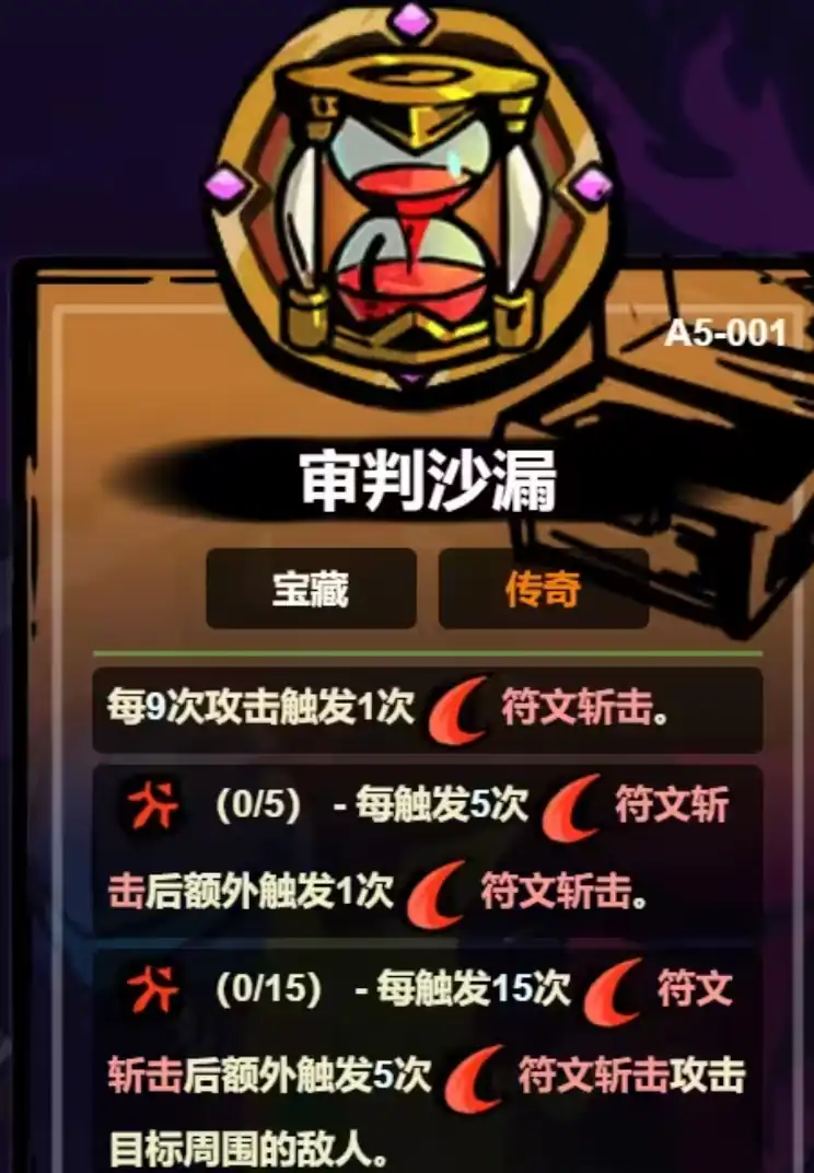 而斩击流派主要是输出手段,因为它需要凭借高频的斩击力,这时候玩家就需要搭配斩击伤害类型的宝物,此时他的核心宝物应该是审判沙漏,眼镜等等。额外辅助保护的话,可以使用无形之刀,猎人印记。