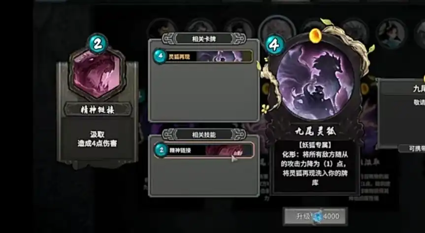 第四张卡牌九尾灵狐,九尾灵狐是狐狸的化形卡牌,这张卡牌可以汲取造成4点伤害,九尾灵狐搭配上九尾芜狐就会变得非常的伤,因为这两张卡牌配在一起用,就相当于在一回合内,敌人打你的次数都被抵消了。