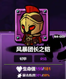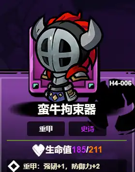 【额度者面具】这个装备的话,是目前游戏中比较流行的中毒玩法首选的护甲之一,作为轻甲十分的便捷,不经可以增加生命值和法力值,同时在本体周围会生成一个带有毒素的效果范围。中甲提供适中的防御力,同时附加一些提升攻击力,暴击率或生命值的属性,是大多数玩家的首选。以高防御力著称,适合需要承受大量伤害的坦克和近战角色。重甲提供高额的防御力,但会降低角色的移动速度和灵活性。对于需要在战斗中吸引敌人火力,保护队友的玩家来说,重甲是不可或缺的选择。【蛮牛拘束器】这个是一个安全感满满的重甲,主属性的生命值,可以大幅度提高生命上限。