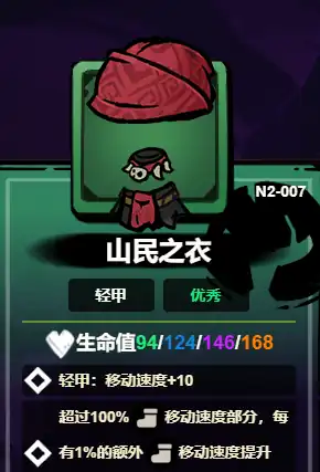 前期如果大家没有办法去获得较为高阶的外观,那么可以选择使用【山民之衣】,这是一个绿色品质的衣服,这件衣服的外观是卡通风格,它主要由红色和黑色组成,设计简洁而富有活力。衣服的主体部分采用红色,这种鲜艳的颜色为整件服装增添了活力和热情。同时,黑色作为辅助色,在细节上进行了点缀,增加了服装的层次感和时尚感。最重要的是,这个套装可以增加10点移动速度,而且作为轻甲中性价比较高的一款,还是很值得各位去进行携带的,当移动速度超过了本体移动上线,可以增加0.5的暴击效果。