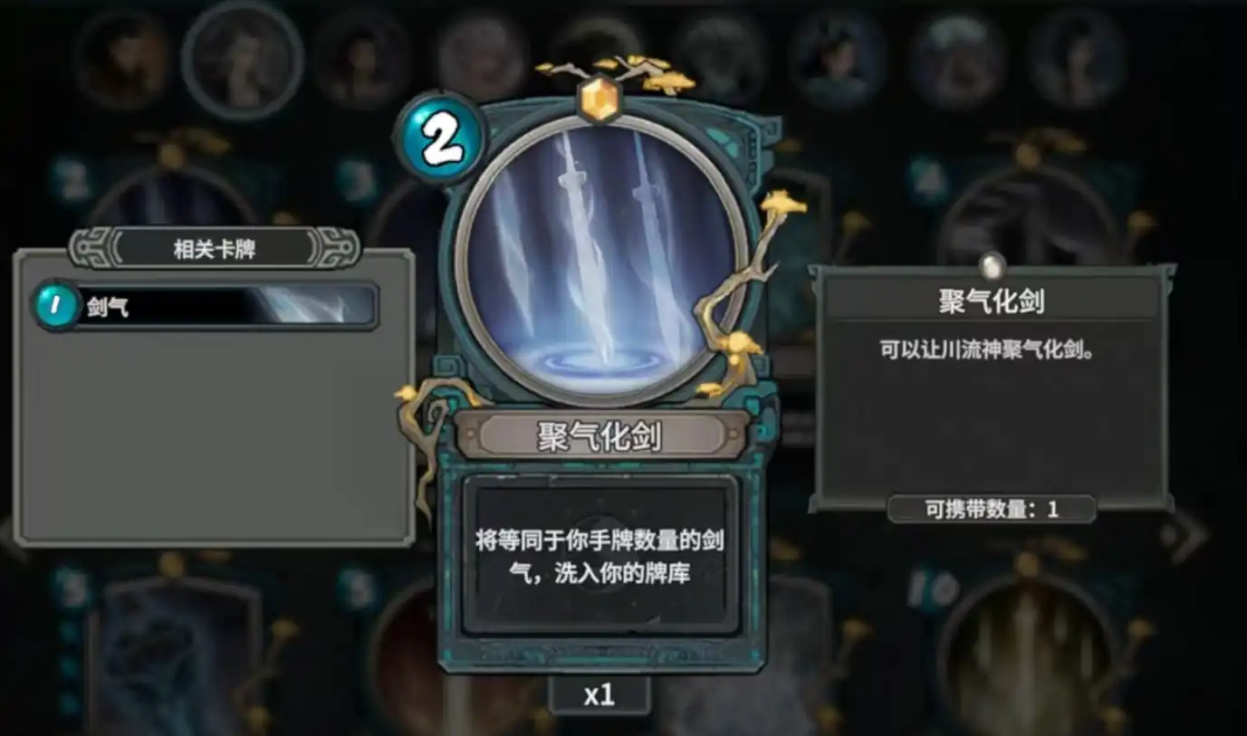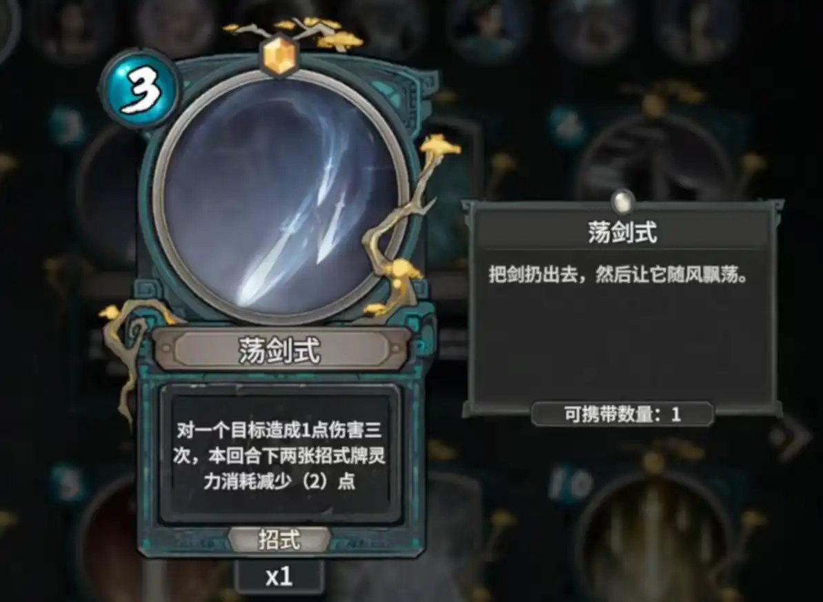 第1张卡牌聚气化剑,将等同于手牌数量的电器洗入牌库,这张卡牌目前虽然并不强势,但是未来可期,如果剑气流起来之后,这张牌绝对是一张很好用的卡牌。第二张荡剑式,对一个目标造成一点伤害三次,本回合下两张招式牌灵力消耗减少两点,比较中规中矩的卡牌。如果想玩招式剑,那么这张牌也是比较不错的。