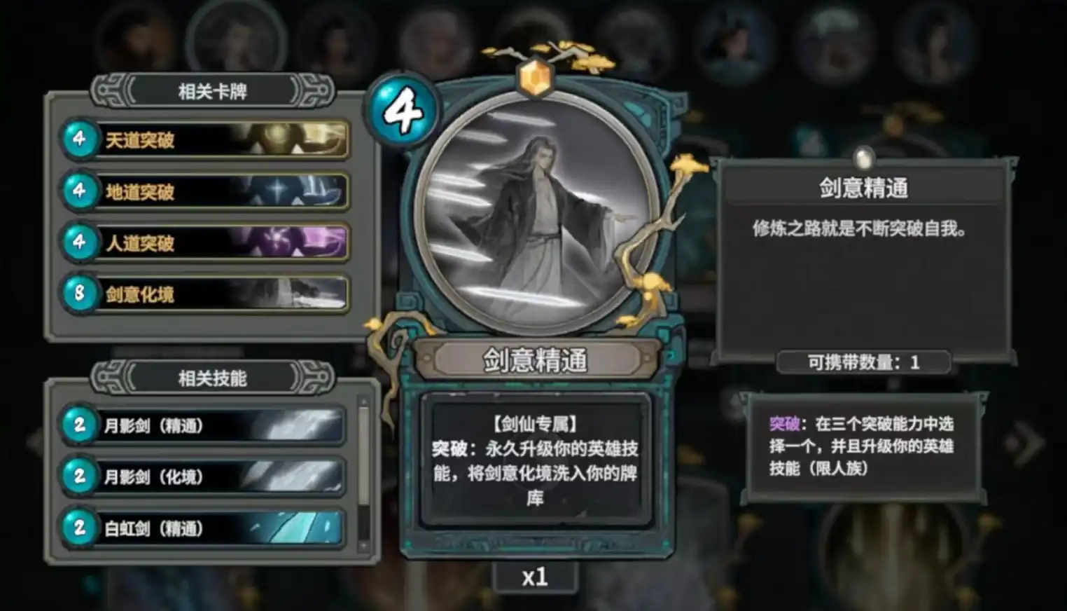 第3张牌是飞剑阵,当使用招式后造成三点伤害,随机分配给所有敌方单位,这张牌经常用于创造奇迹,也是玩招式剑卡组中不可缺少的一张牌,缺点在于4费比较拖节奏。第4章突破,属于剑仙专属,突破后永久升级英雄技能,将建议剑意洗入牌库。突破指的是在三个突破能力中选择一个并且升级英雄,是属于人族专属能力。可以说剑仙的突破还是非常不错的,剑仙一技能三阶真的非常强,只要对面有杂鱼怪,就可以打出高额的伤害。虽然突破也有点拖节奏,但是三阶突破技能强,所以评分很高。