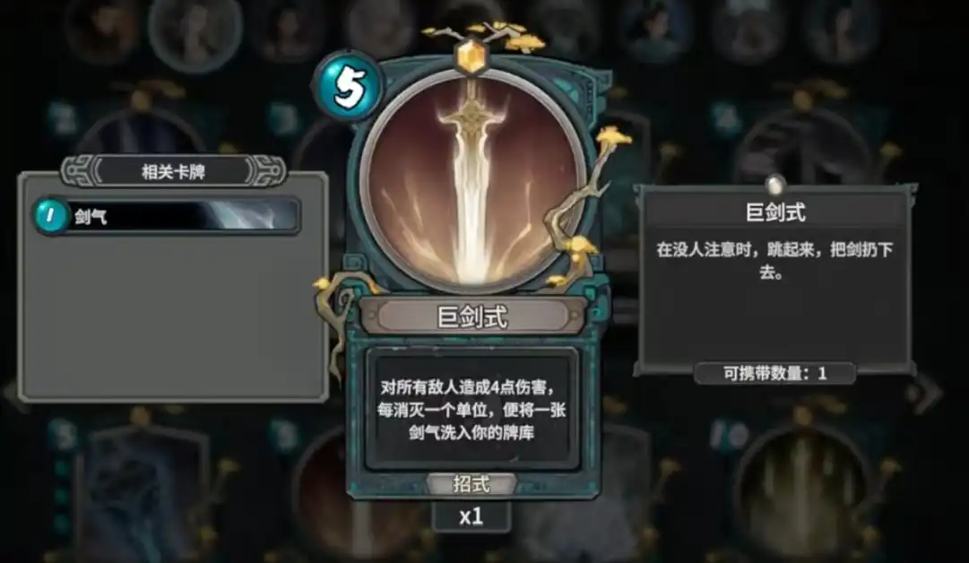 第5张是巨剑式,对所有敌人造成4点伤害,每消灭一个单位就可以将一张剑气洗入牌库。第6张是五玄剑尊,效果是重新释放在本局对战中使用过的5张不同的招式牌,目标是随机的。这两张牌是属于相互强化相互成就的关系,五玄剑尊可以释放巨剑式,如果分开打或许并不强势,但如果在一起绝对非常强悍。