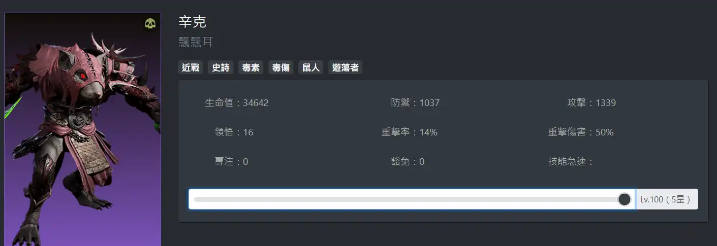 辛克作为鼠人游荡者,不仅精通毒术,还因其史诗的稀有度,成为平民玩家轻松获取的强力选择。通过太阳季轮替召唤卡池,玩家可以较容易地抽取并培养这名角色。在满星100级时,辛克的基础属性为:生命值34642、领悟16、防御1037、重击率14%、攻击力1339、重击伤害50%。