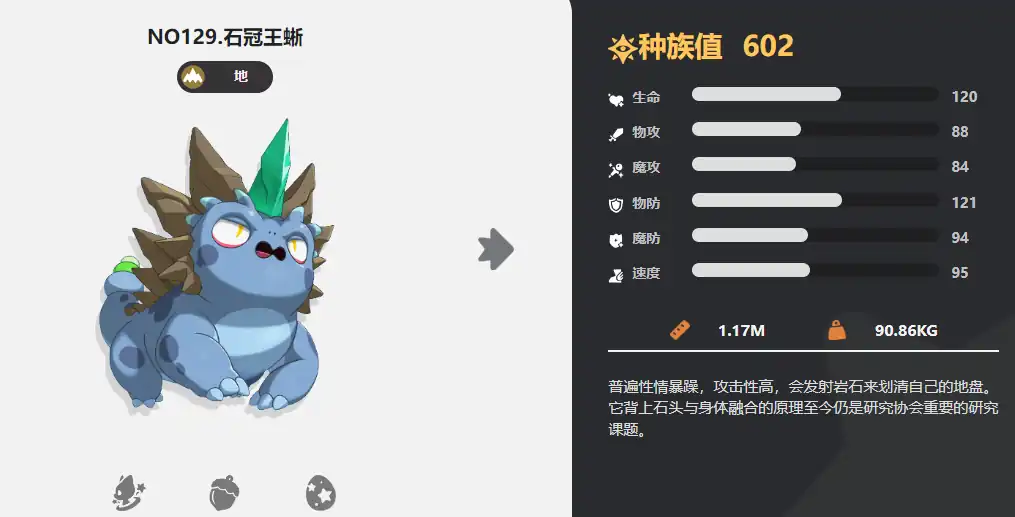 石冠王蜥是一个性情暴躁的狠角色,只要对方来到自己的地方的话,他就会无情的发射一些岩石碎块来攻击对手。以此来划清自己的地盘界限,而且将所有的石头都融入自己的身上。然后有着高额的生命值以及双攻,自身也拥有高额的物理防御,无惧各种天然灾害。