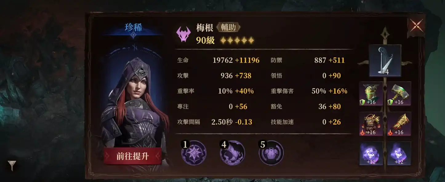 梅根:她作为回血辅助,在阵容中扮演非常重要的角色,最好能升到五星。需要注意的是,梅根的防御力必须有所保障,防止过早被击倒影响续航。装备上建议添加一个技能加速装备,以确保她能够跟上战斗中的治疗消耗。她的回血技能速率非常重要,决定了全队的生存能力。