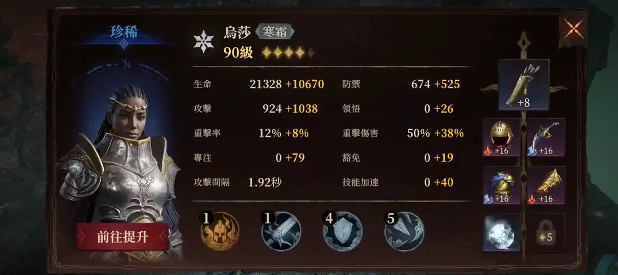 乌莎:乌莎是寒霜冰属性的输出角色,在副本中主要负责攻击手。她的装备应该以堆叠攻击力和防御力为主,防御力至少需要达到+500才能在副本中站得住脚。技能速度建议加到40,确保技能的释放频率。乌沙的威能技能是强力的范围输出,能够对敌方施加寒霜状态,并且对寒霜状态目标造成双倍伤害。这种技能特性使她成为高性价比的蓝色稀有度输出角色。当然,如果玩家手中有更高级的输出角色,也可以考虑用来替代她。