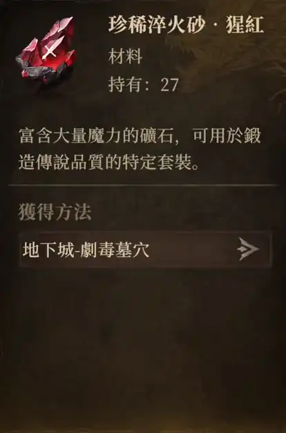 剧毒墓穴7是比较关键的装备本,因为玩家越早通过,就能越早收集到珍稀淬火砂·猩紅的材料,这个矿石材料可以锻造传说级别的装备,黄装可以精练到+20,是目前版本的顶尖套装。