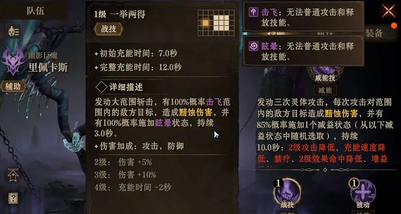 除了被动技外,里佩卡斯还拥有一举两得这个战技,可以发动大范围斩击,有100%的概率击飞范围内的敌方目标,并造成基于攻击力和防御力加成的黯蚀伤害。此外,还有100%的概率施加眩晕状态,持续3秒,实际的效果会随着技能等级提升。该技能还具有一些特殊的附加效果,能在一定程度上增加角色的战力。它的威能技幽灵戏耍,使用时会发动三次灵体攻击,每次攻击对范围内的敌方目标造成黯蚀伤害,同时有35%的概率减少目标的威能,并且有85%的概率施加一个减益状态。