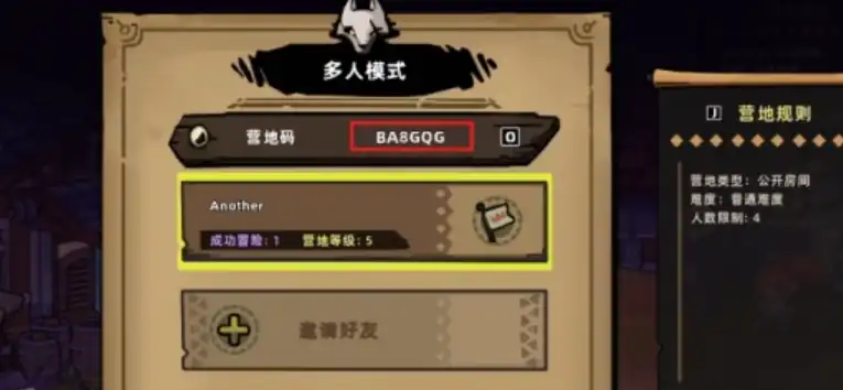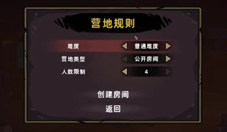 比如说挑战的难度,一般来说联机的情况下都会挑战困难模式,毕竟这样更有挑战感,接着就是人数,目前人数最多只是四个人,可以根据自身的情况减少人数,最后就是创建房间,这时候会有一个营地码,其余的队友跟着营地码就能加入房间,从而开始联机游戏。