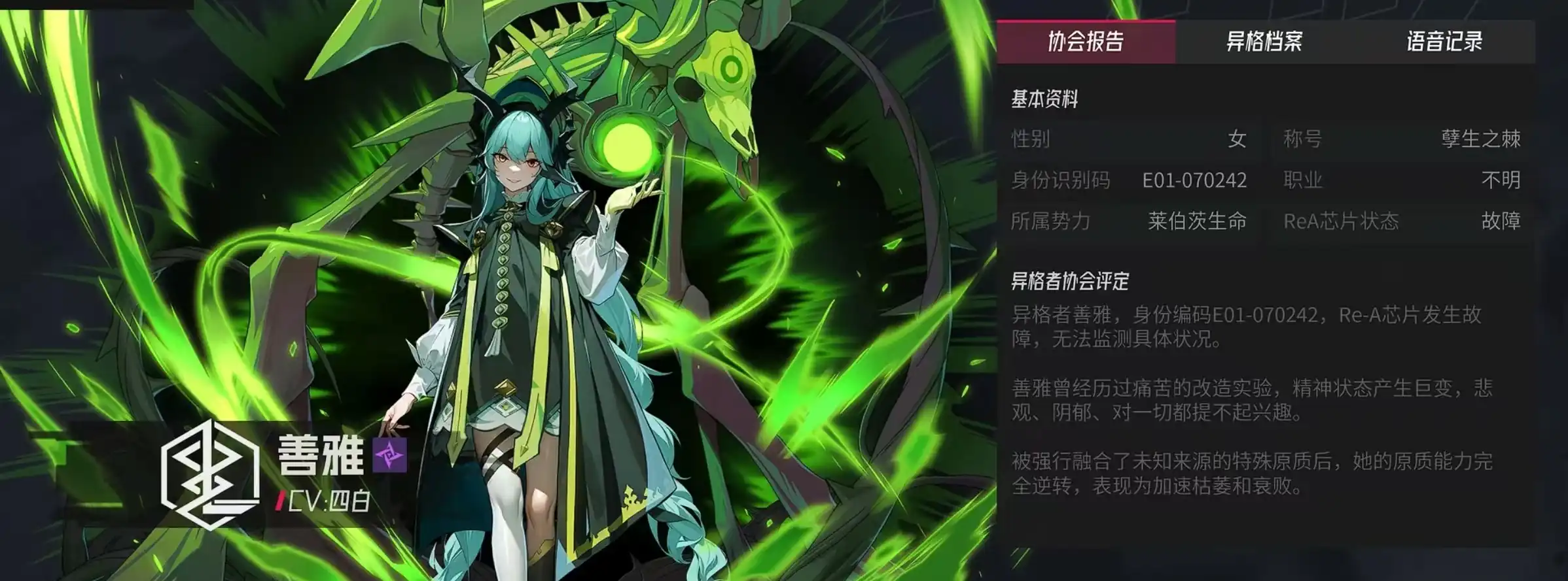 根据目前伊瑟重启日中所公布出来的这些角色外形,大家不难发现,其实绿头发角色指的就是善雅。善雅是属于恒定源质属性的sr稀有度人物,属于超链者协会,称号是净善之女。善雅曾经是一所孤儿院的孤儿,后来和人类形成了收养关系,她性格孤独但能量波动稳定温和,循环不息,如同本人一样温柔和煦,可以抚平伤痛,展现出了强大的治愈能力,这些能力也体现在了她的技能中。