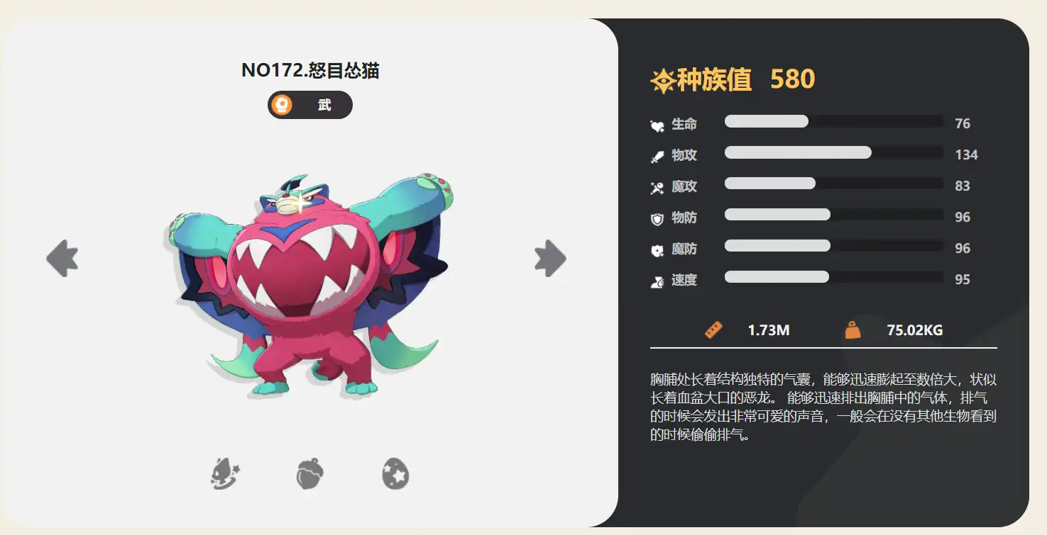 从属性上看,怒目怂猫在生命值、魔攻和速度上表现较为优异,同时其物攻属性也较为均衡,能够适应不同的战斗环境。