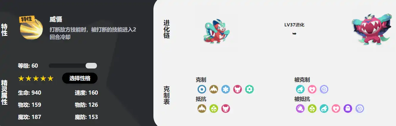 五星属性面板(60级):生命:940、速度:160、物攻:159、物防:126、魔攻:187、魔防:153。