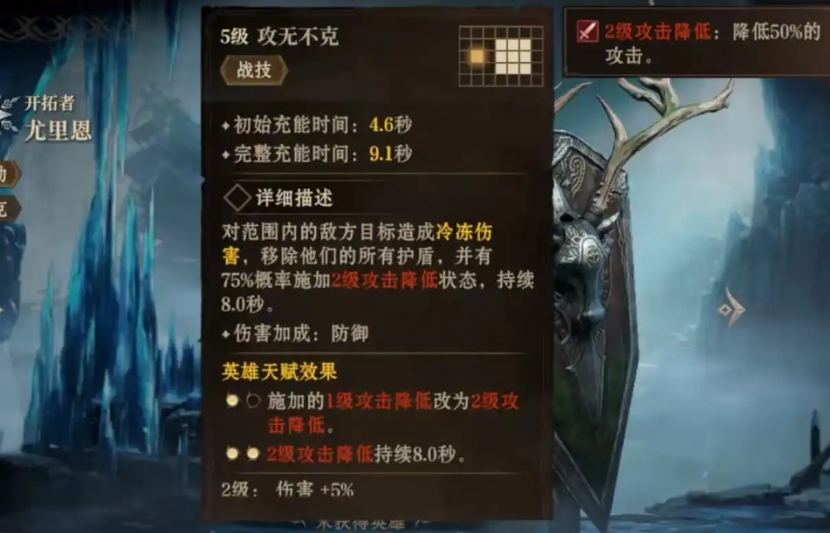 攻无不克是尤里恩的战技,使用这招能对一个范围内的敌方目标造成冷冻伤害,还会移除他们的所有护盾,并有75%的概率施加2级攻击降低状态。该技能不仅能造成可观的冷冻伤害,还可以有效地克制敌方带有护盾的英雄,并且降低敌方的攻击力,为己方团队减少受到的伤害。