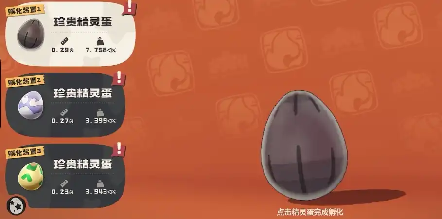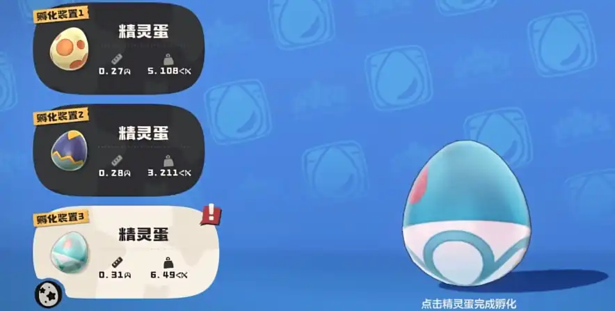 关于精灵蛋的孵化靠的是时间,具体的时间可以从精灵蛋板块中了解,当精灵蛋成功孵化后可以准备下一颗精灵蛋来进行孵化了。