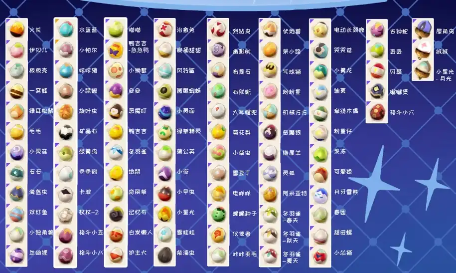 因为精灵蛋的内容有很多,后续还会伴随新上线的精灵而增加,所以说给玩家们列一个图,详细的根据图片来即可。
