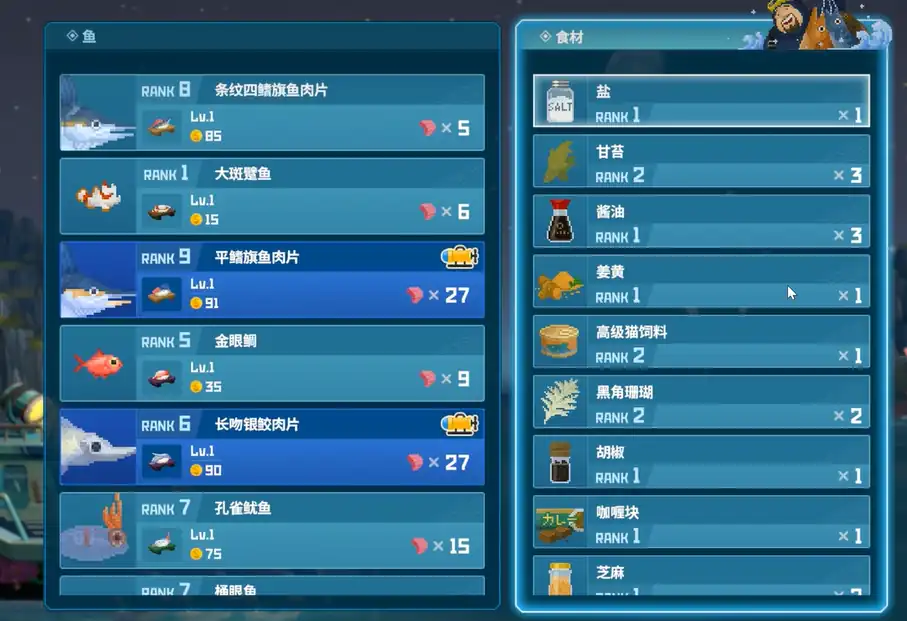当戴夫逐渐深入到潜艇右侧,来到约100米深的区域时,另一种剑鱼——平鳍旗鱼便会出现在玩家视野中。这些鱼更为精致,出没的位置也更具挑战性。玩家需要提升自己的装备与技巧,才能顺利捕捉到它们。不过,正因为如此,抓住平鳍旗鱼的成就感也格外高。