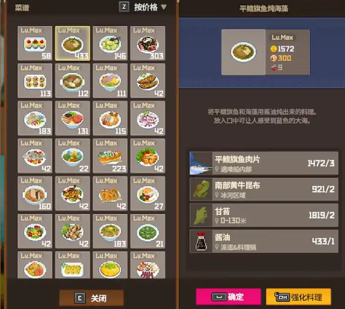 在节日经营上,不同节日需要搭配对应的高收益菜谱。例如,旗鱼节可以准备平鳍旗鱼炖海藻,所需材料为平鳍旗鱼肉3个、南部黄牛昆布2个、甘苔2个和酱油1个。这道菜初始售价高达425档,是全游戏价格最高的菜品之一。虾节可以选择醋拌普塔虾,材料包括普塔虾3个、黄瓜2个、黑角珊瑚3个和黑醋1个。虾类繁殖快,节日收益高,非常值得优先考虑。而金枪鱼节推荐金枪鱼生鱼片盖饭,材料为蓝鳍金枪鱼红肉3个、白米3个、鸡蛋1个和芝麻1个,虽然售价略低,但原料易得,操作简单。