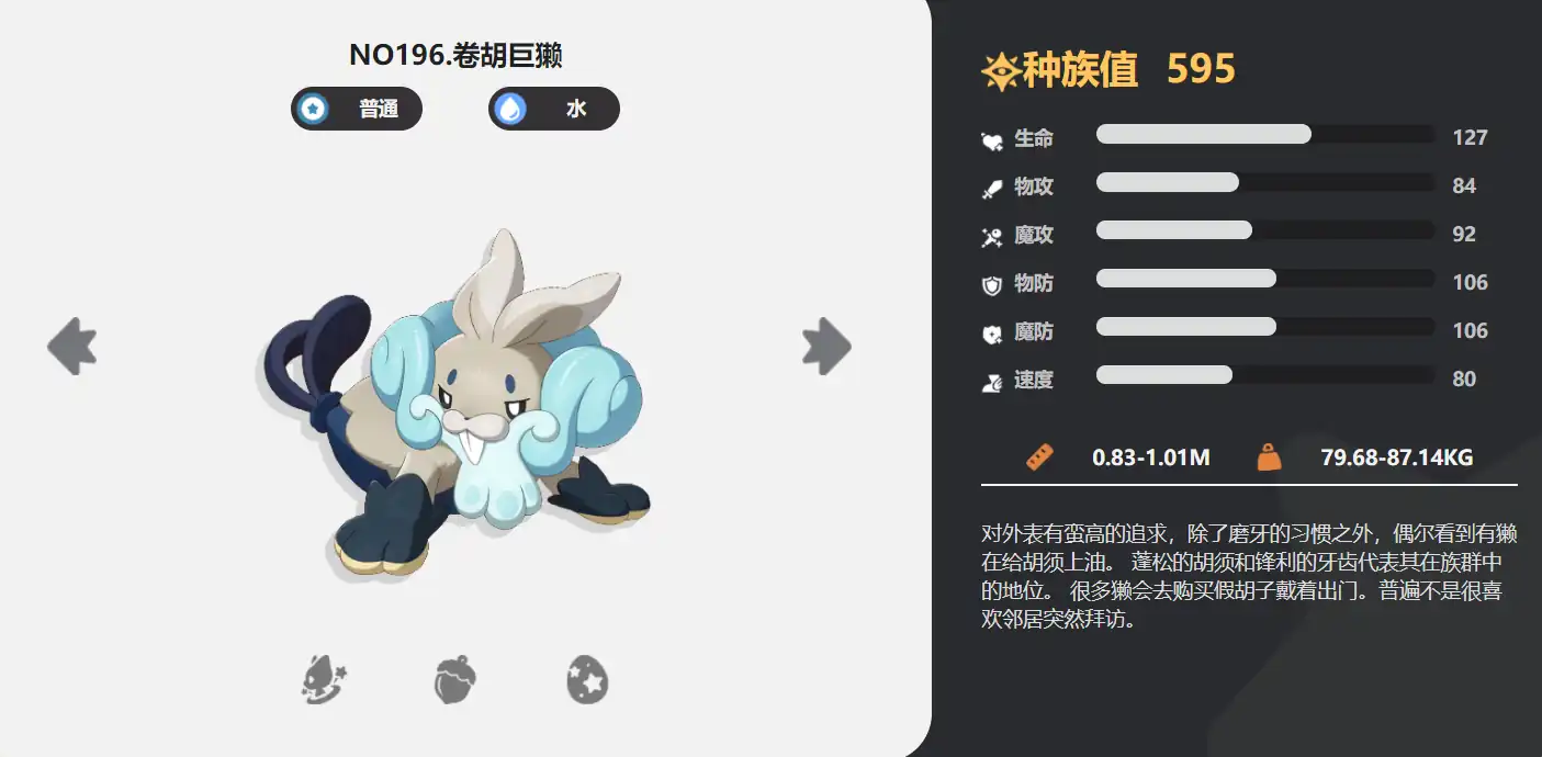 它的五星属性面板如下:生命:940、速度:160、物攻:159、物防:126、魔攻:187、魔防:153。从属性面板来看,卷胡巨獭的防御较为突出,是水系不错的防御宠物,尤其适合一些生存和续航需求较高的场景。