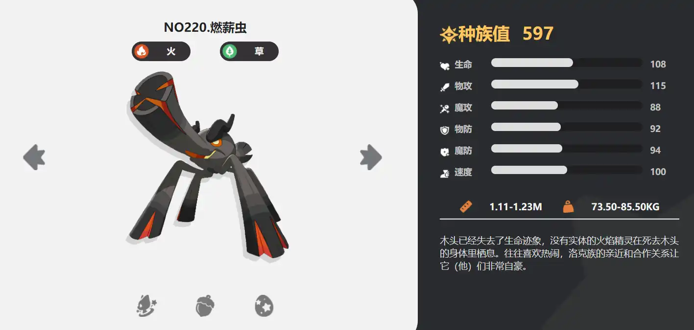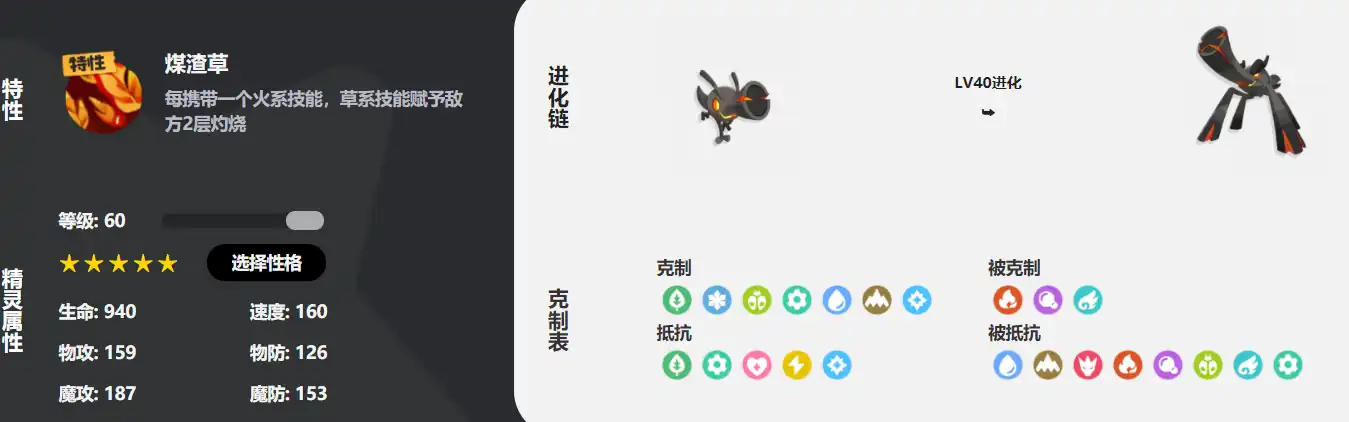 特性:煤渣草。燃薪虫每携带一个火系技能,草系技能便能额外赋予敌方2层灼烧效果。这使得燃薪虫在战斗中能够频繁叠加灼烧状态,为队伍创造更多输出机会。