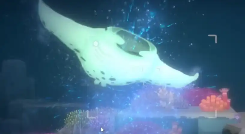 到了晚上,潜入海中靠右侧的区域,很快就能看到那个灯具。走近之后,按照提示将灯具扶正并装上电池,这一步完全是手把手教学,跟着任务指引就行了。灯具亮起后,不用做别的,安静等待大块头的鬼蝠鳐慢悠悠地游过来就行。
