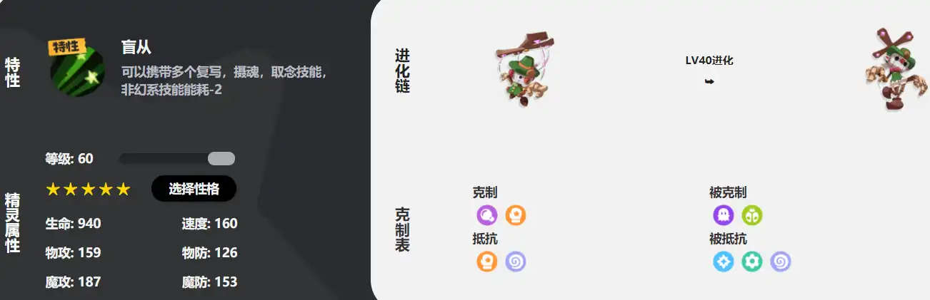帅帅魔偶在5星满级60时的属性面板为:生命:940、速度:160、物攻:159、物防:126、魔攻:187、魔防:153。从属性上看,帅帅魔偶的速度和魔攻表现突出,非常适合打先手输出,同时较高的魔防也让它在面对特殊攻击时具备一定的生存能力。