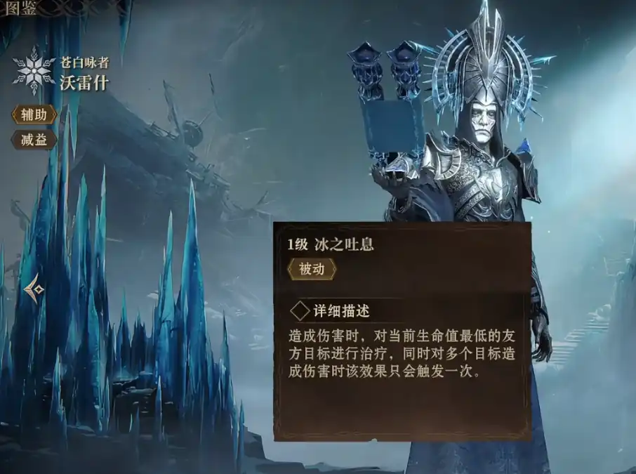 沃雷什:是一个非常好用的史诗辅助。他的被动技能会对生命值最低的友方目标进行治疗,当技能对多个目标造成伤害时,该效果仅触发一次。威能技可以对所有敌方目标造成三次冷冻伤害,并有75%的概率施加增益无效状态。沃雷什对那些依赖增益效果的Boss,如血王子齐诺斯,有非常强的克制作用,在推图时表现出色。