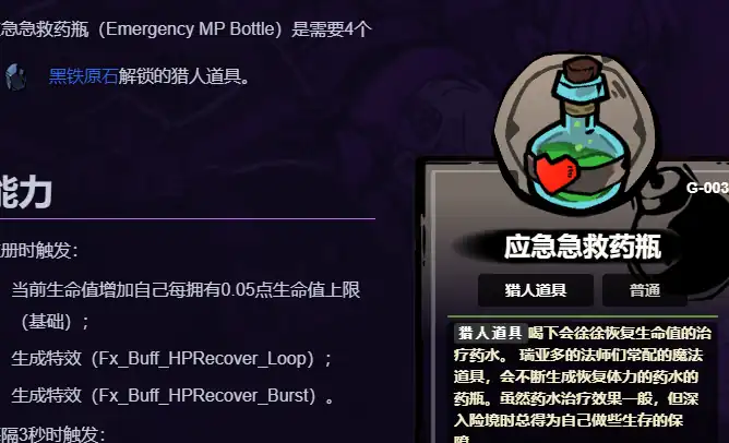 使用这个道具会缓慢的回复生命值,比较适合游戏中的法师去进行使用,每次使用都可以增加0.5的生命值上限,会持续15秒,大几爱可以使用四个黑铁原石去进行合成的。