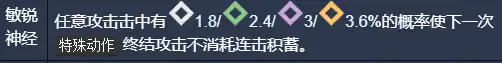 敏锐神经:攻击击中有小概率让下一次连击点数不消耗。对于依赖连击点数的近战武器来说,敏锐神经能够显著提升连击效率,增加输出伤害。