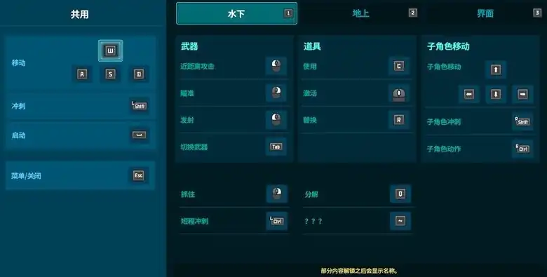 如果是在水下的话,鼠标左键是近距离攻击,鼠标右键是瞄准,瞄准后左键发射,tab键则是切换武器。在有可以互动的物件时,鼠标右键是抓住,然后左ctrl键是短程冲刺。