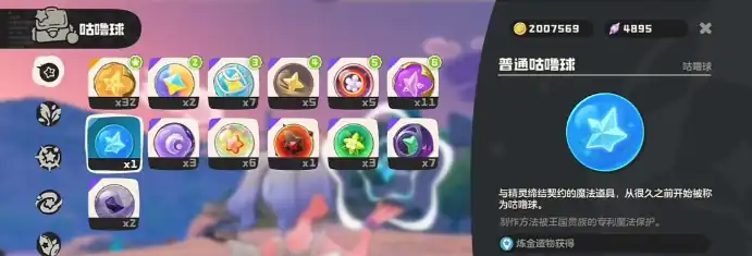 普通咕噜球就是用来抓取精灵的道具,获取渠道很多,可以在每日调查中领取,也能通过大世界收集自己收集矿石等材料,在炼金台里面就可以免费合成。
